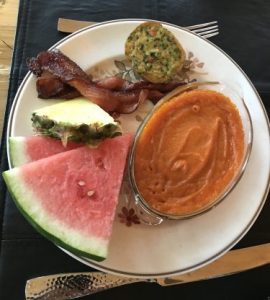 Badrock B&B has been described as “The farm to table style homemade breakfast.” Every morning starts out with freshly brewed coffee. Our adjoining dining rooms accommodate twenty-four guests at three large tables, not including a private setting and outdoor dining tables, where breakfast is served. Breakfast is served Montana style, hearty, plentiful and delicious, from a collection of unique Badrock recipes. Each morning serves a different breakfast delight, which may include a combination of…thick cut bacon, cage free eggs, sausage and potato casserole, oven baked blueberry breakfast cake, special homemade baked scones and muffins or our guests’ favorite fluffy Belgium waffles heaped with strawberries and whipped cream. Guests are encouraged to linger at breakfast, where the conversations will likely center around yesterday’s hiking experiences, current activities at Glacier National Park, and the latest grizzly bear stories.